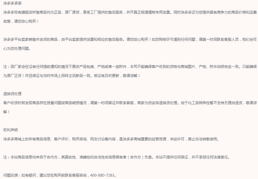 声明:您可在购买前对产品信息、运输方式、付款方式、库存等方面进行咨询,商家看到后会及时回复!由于商家随时变更会产品的包装、 参数等信息,所以该回复仅在当时对提问者有效,其他买家仅供参考!