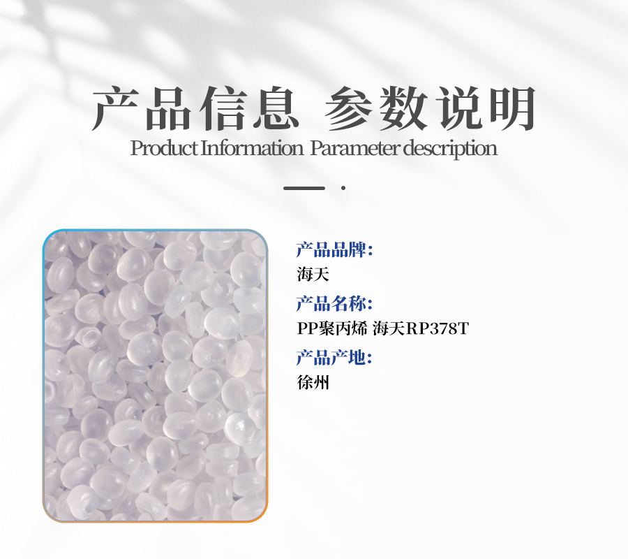 商品名称:PP聚丙烯 海天RP378T 商品货号 : TDD019796 品牌 : 海天 产地 : -- 产品型号 : RP378T 包装规格 : 25kg/袋 等级 : 优等品 生产许可证号 : -