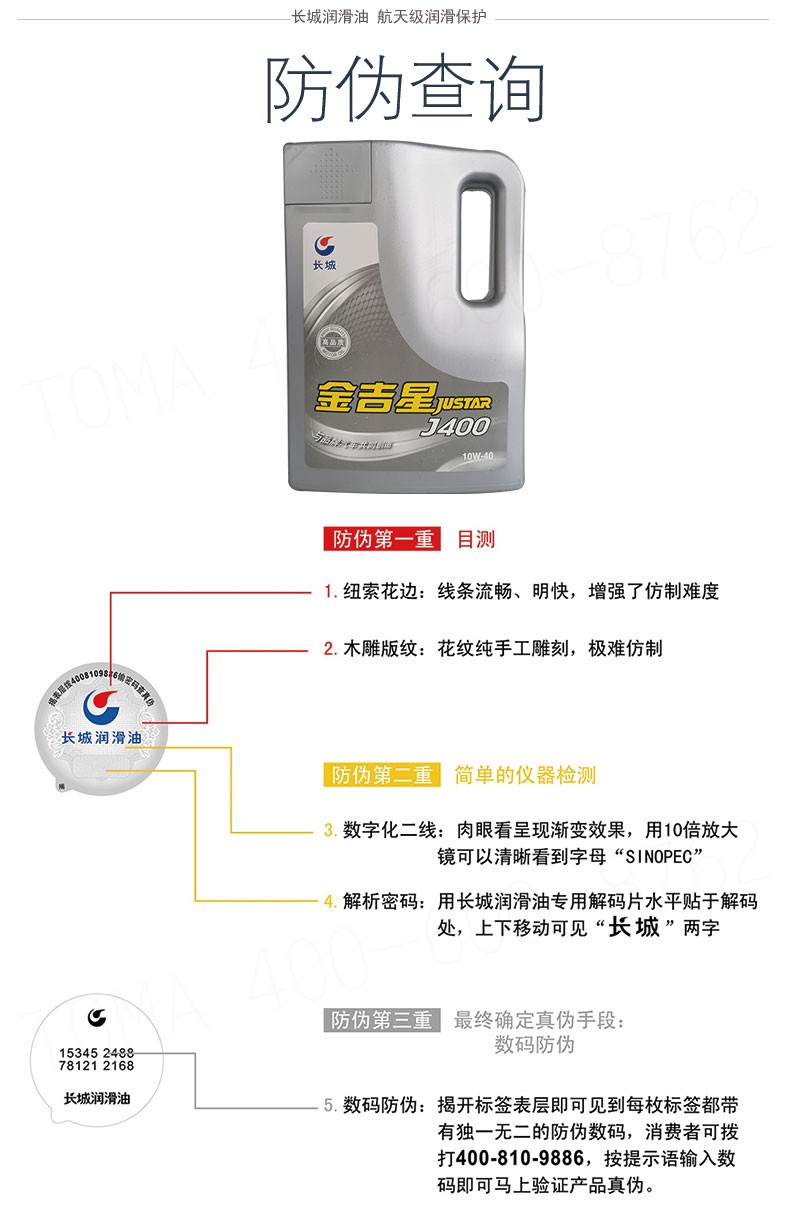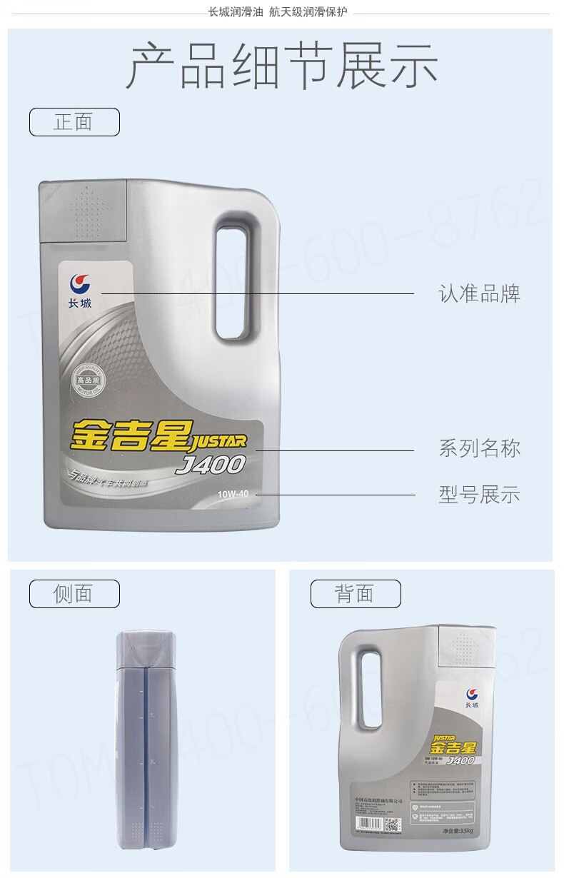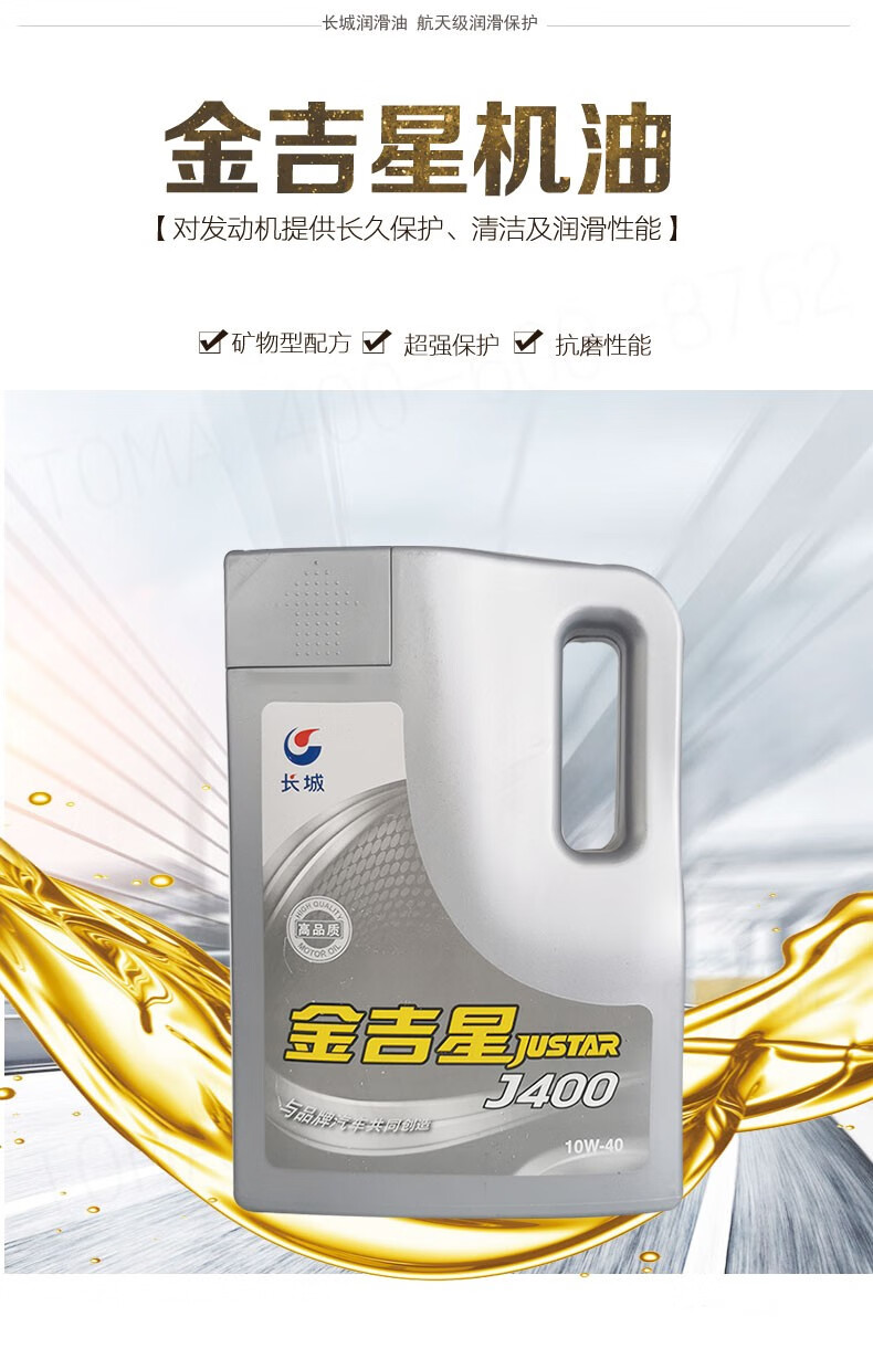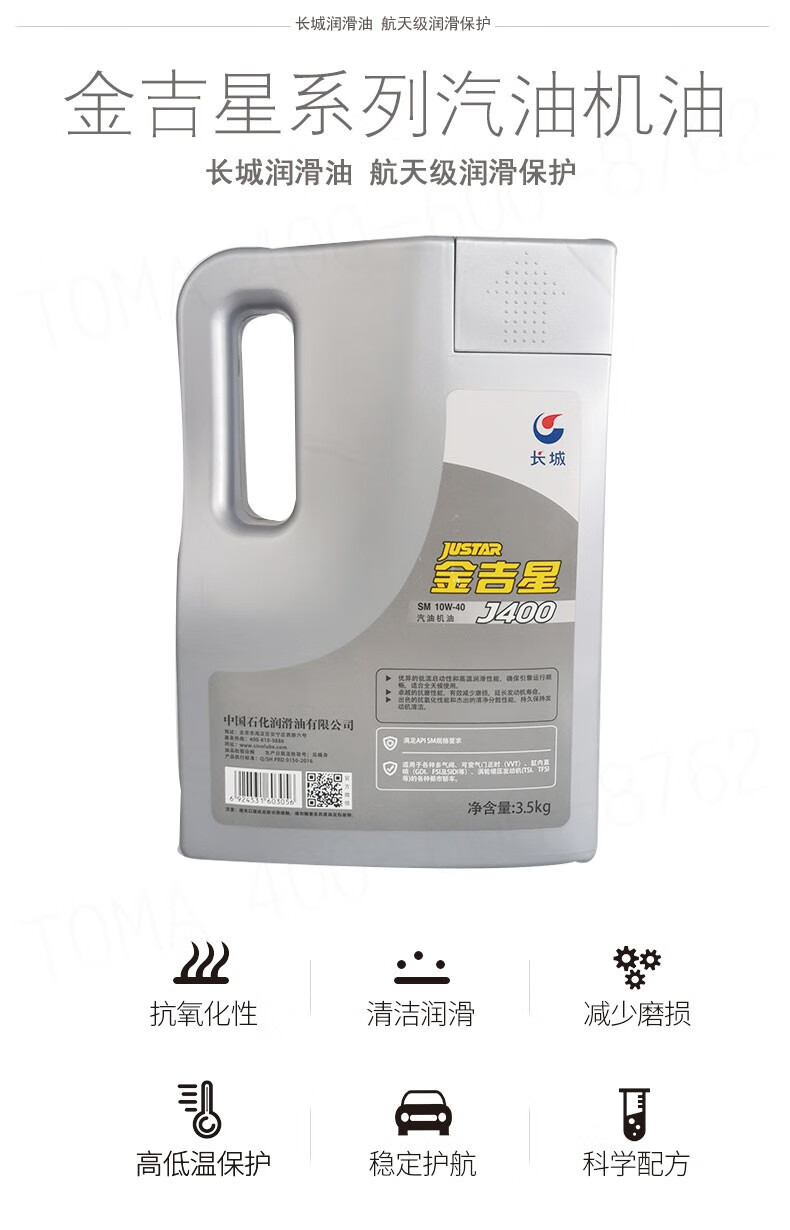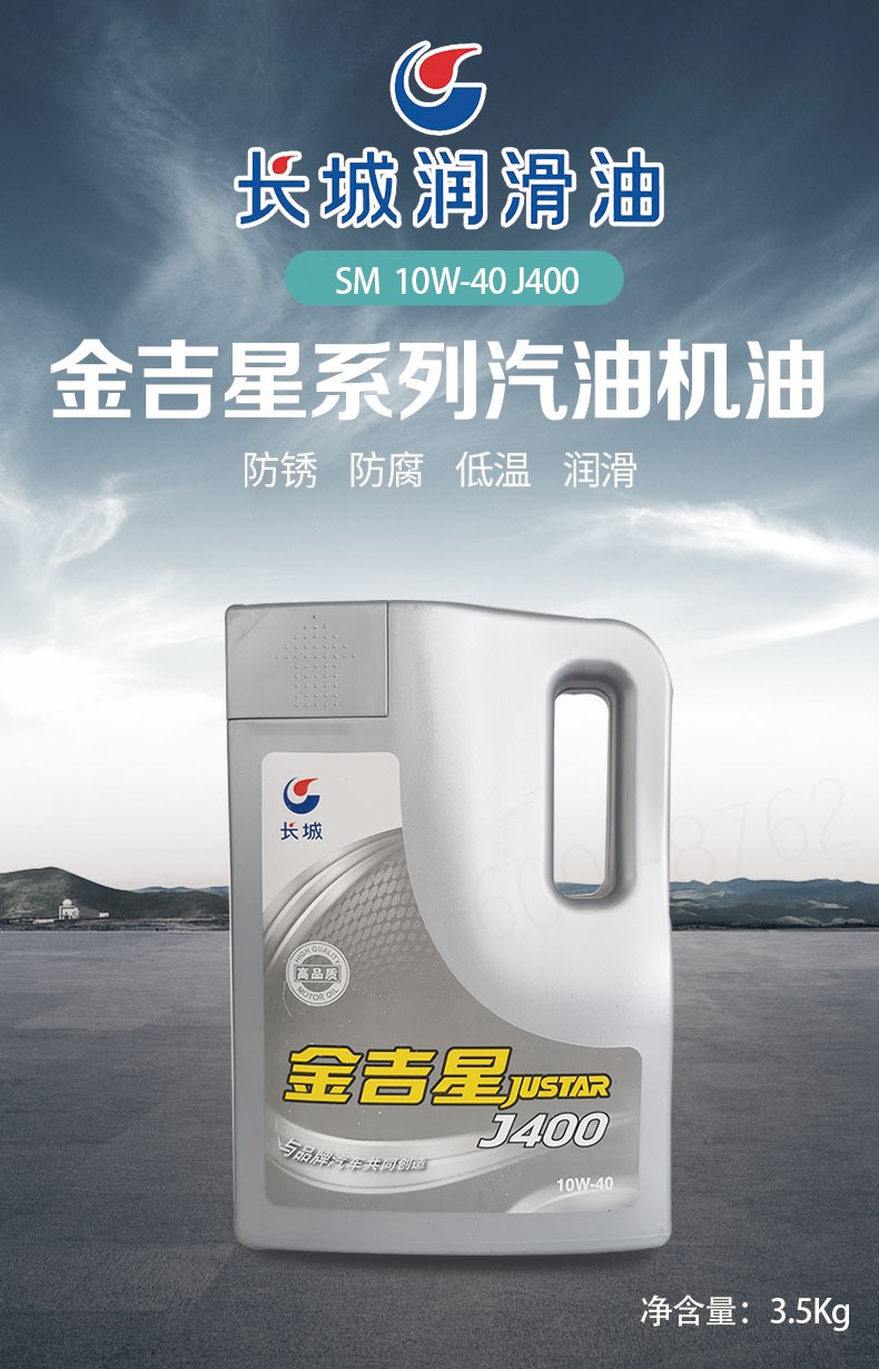 商品名称:长城金吉星J400 10W40 SM 4L 商品货号 : TDD009468 品牌 : 长城 产地 : -- 产品型号 : 6*4L/箱 包装规格 : -- 等级 : -- 生产许可证号 : --